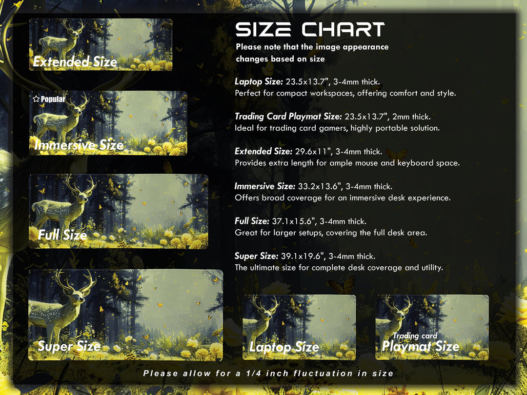 Embrace the golden hour of nature with Floral Enchantment Design 3, a desk pad that encapsulates the splendor of a sunlit forest. In this idyllic scene, a majestic stag is bathed in the glow of soft, golden light, amidst a lush meadow of yellow blossoms. The forest's natural majesty is heightened by the presence of fluttering butterflies, their wings catching the light, adding an element of dynamic beauty. This desk pad not only brings a slice of the enchanted woods into your workspace but also ensures premium comfort with its plush 3-4mm anti-slip rubber base and smooth microfiber surface. Every edge is neatly sewn, promising resilience and an upscale look that complements any setting. Perfect for the refined professional or the dedicated gamer, it stands as a testament to both form and function, elevating the aesthetic of your daily engagements.