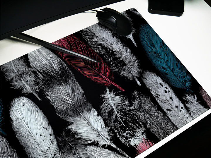 Whispered Plumage brings a sense of gentle rhythm and organic elegance to your workspace. This design features a seamless cascade of feathers, arranged vertically across a charcoal-gray background. The feathers vary in texture and detail, showcasing intricate linework and a range of shading that evokes vintage botanical illustrations. Hues of soft silver, graphite black, and creamy ivory are punctuated by striking pops of crimson and teal, lending the pad a subtle vibrance without overwhelming the eye. These feather motifs suggest movement, lightness, and calm — a quiet moment in motion, captured in art. Ideal for those who appreciate nature-inspired designs and a sophisticated, boho-modern aesthetic. Crafted for performance as well as beauty, this desk pad offers a 3-4mm cushion thickness for wrist support, a high-quality microfiber surface for effortless mouse tracking, and a non-slip rubber base for rock-solid grip during use. A perfect addition to both creative and professional setups alike.