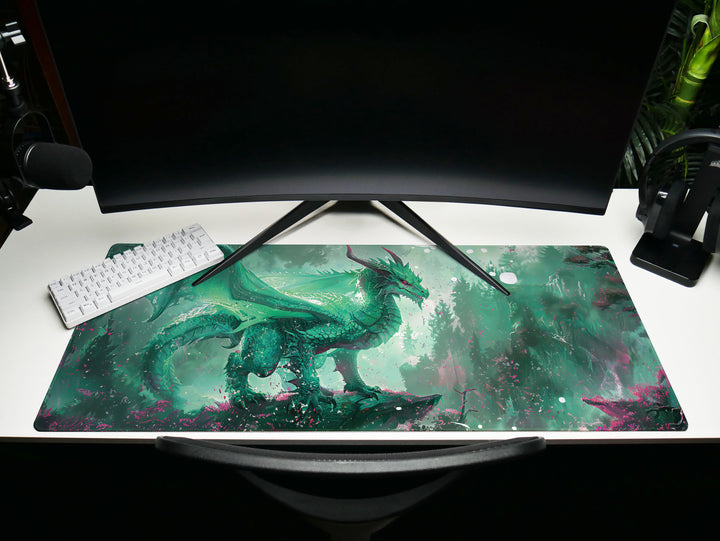 Majestic Mythos Design 4 welcomes you to the realm of the Emerald Enchanter, a splendid dragon ensconced within the heart of a mystic grove. This desk pad depicts the dragon’s jade-hued scales that gleam with a spellbinding allure, reflecting the vitality of an enchanted forest. The air is alive with magenta blossoms carried by the whispering winds, creating a scene that sings of ancient magic and verdant splendor. Here, the dragon stands as the sovereign of flora and fauna, a majestic guardian of the grove’s secrets. The desk pad itself combines elegance and utility, with a plush microfiber surface for precise cursor movement and a robust, slip-resistant base to anchor your every endeavor. It's not just a desk accessory; it's a gateway to an immersive fantasy, where nature’s deepest wonders are but a glance away.