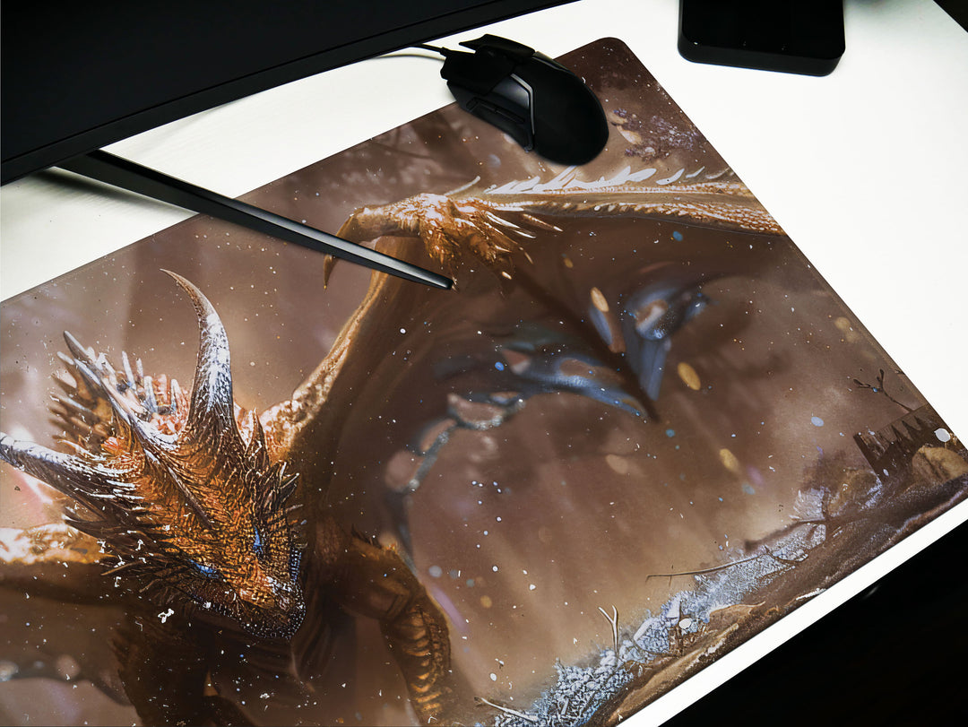 Introducing Design 1 in our Majestic Mythos collection, this desk pad captures the grandeur of a mighty dragon standing proudly amidst an enchanted forest landscape. Its scales shimmer with the wisdom of ages and the wildness of nature, a testament to the timeless tales of epic fantasy. Surrounding the beast, the wilderness teems with the glow of twilight magic, where trees whisper secrets of old. The scene, set in a mystical clearing, hints at adventures untold and legends unfolding. Every detail, from the dragon's piercing eyes to the delicate frost on the winter-touched ground, is rendered in breathtaking clarity, bringing this mythical creature's domain right to your workspace. Crafted with our signature care, the desk pad promises ergonomic support with a 3-4mm thickness, a non-slip rubber base for stability, and a smooth microfiber surface for precision tracking. It's an illustrious addition to any desk, inviting you to lose yourself in imagination and inspiration.