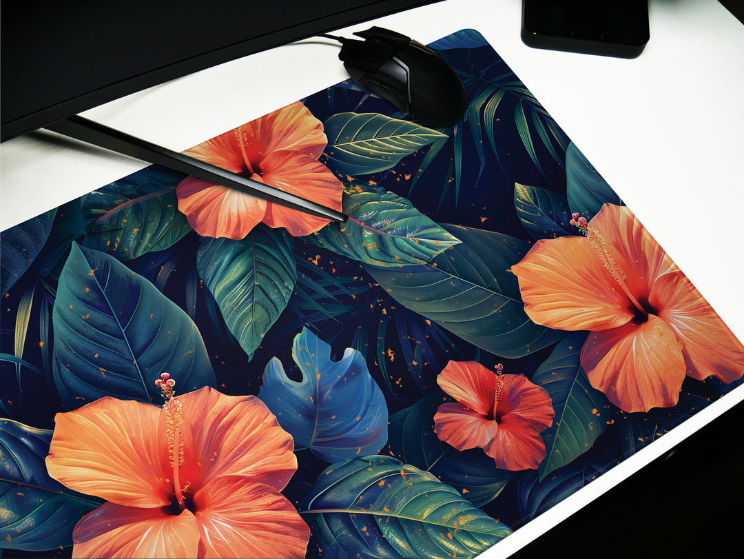 Design 2 of our Tropical Escape series brings the fiery allure of the radiant hibiscus to the forefront, complemented by an enchanting array of verdant foliage. The rich, warm orange petals contrast beautifully with the cool blue-green leaves, creating a desk pad that's as energizing as it is elegant. It's a botanical celebration that captures the essence of a tropical retreat right at your desk. Crafted with care, this pad ensures a satiny-smooth surface for your mouse and a non-slip base that anchors your ambitions, no matter how vigorous your work pace. Let this lush landscape reinvigorate your workspace, sparking creativity and a sense of calm with every glance.