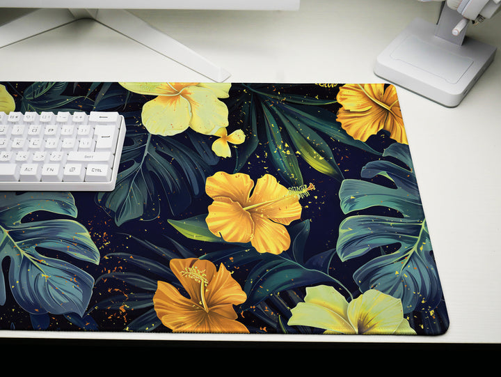 Tropical Escape Design 3 is a sublime addition to our collection, featuring nighttime flora bathed in moonlight. The golden yellow hibiscuses are like stars that have descended upon a sea of dark, leafy greens, creating a calming yet invigorating scene for your workspace. This desk pad not only captivates with its beauty but also with its practicality, providing a perfectly smooth surface for your mouse and robust support with its anti-slip backing. It's a piece that promises to infuse your office with the charm of an enchanted tropical night, making every task a little more magical.