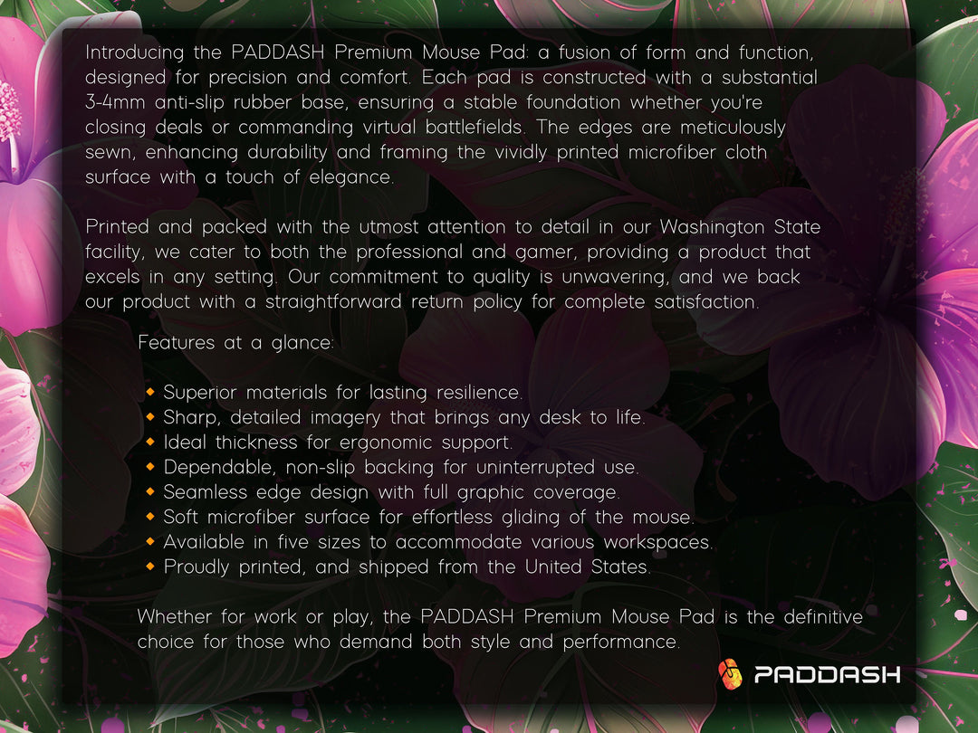 Tropical Escape Design 6 captures the essence of a floral paradise with lush magenta blossoms that seem to dance across a canvas of rich green foliage. This desk pad is a tribute to botanic artistry, with each petal and leaf rendered in exquisite detail against a backdrop speckled with playful pink accents. Designed to enhance both the functionality and aesthetics of your workspace, it offers a supremely smooth surface for your mouse and a steadfast grip with its anti-slip base. This piece isn't just a desk pad; it's an everyday luxury that brings the vibrancy of a tropical garden to your professional or gaming endeavors.