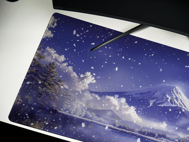 Elevate your workspace with the 'Serene Landscapes Design 2', capturing the tranquil essence of a winter wonderland. This desk pad presents the majestic Mount Fuji, enveloped in a serene dance of snowflakes, with a palette of cool blues and pristine whites that evoke a peaceful, meditative state. Gaze upon the reflective waters and frosted pines, a scene that invites calm to any busy day. Designed with a 3-4mm anti-slip rubber base for steadfastness and a microfiber cloth surface for smooth mouse movement, it's more than a pad; it's a daily retreat for your senses.
