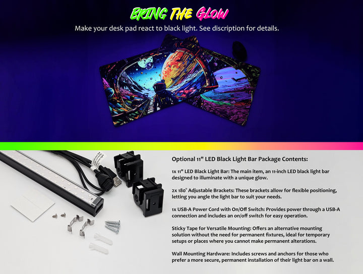 To make the glow effect easy to enjoy, we also offer an optional 11" USB-powered black light bar that pairs perfectly with your setup. Just plug it in, and watch your desk pad transform into a striking centerpiece for work or play.